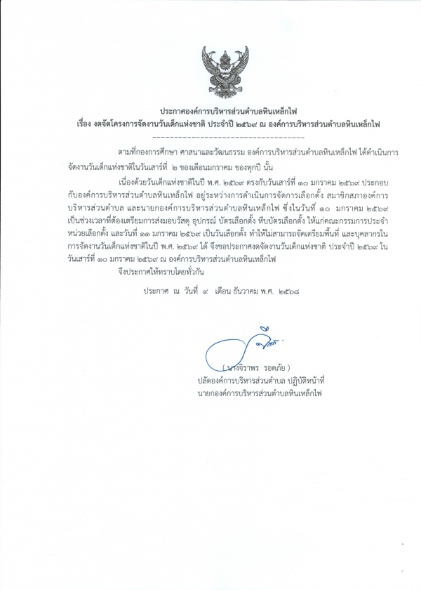 ประกาศ เรื่องงดจัดโครงการจัดงานวันเด็กแห่งชาติ ประจำปี2569