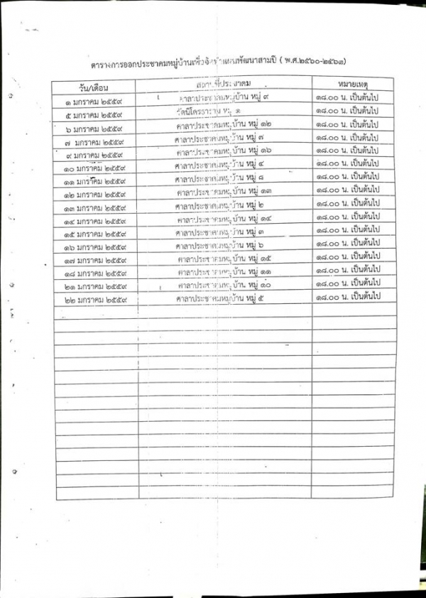ตารางการออกประชาคมหมู่บ้านเพื่อจัดทำแผนพัฒนาสามปี (พ.ศ. 2560-2563)
