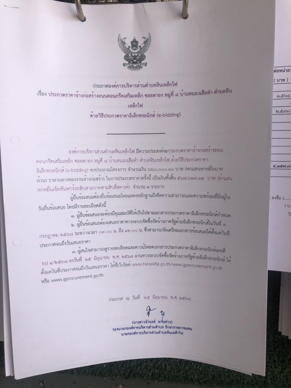 ประกาศประกวดราคาจ้าง โครงการก่อสร้างถนนคสล. ซอยตายง หมู่ที่ 8 บ้านหนองเสือดำ