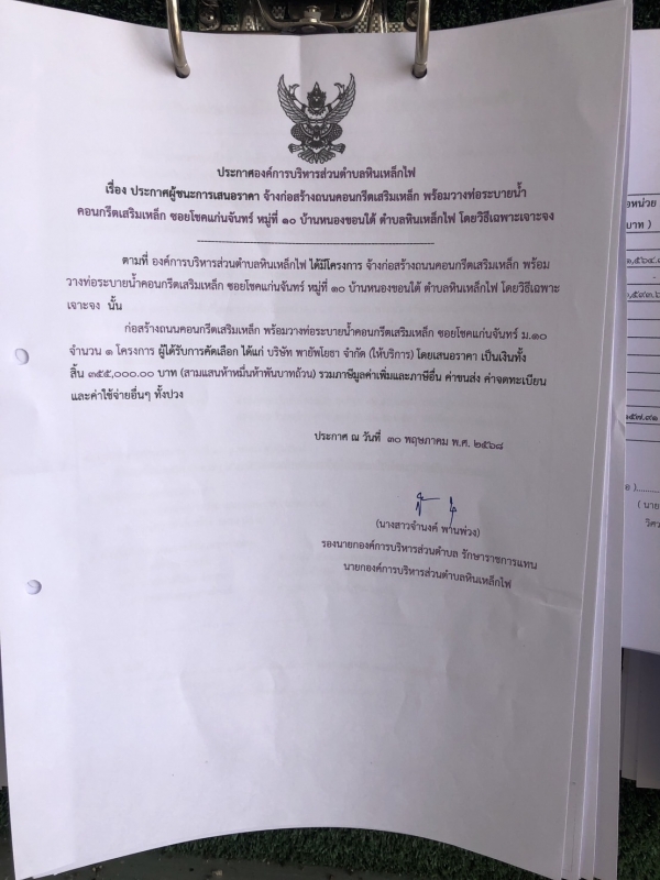 ประกาศผู้ชนะการเสนอราคา โครงการก่อสร้างถนนคอนกรีตเสริมเหล็ก พร้อมวางท่อระบายน้ำคอนกรีตเสริมเหล็ก ซอยโชคแก่นจันทร์ หมู่ที่ 10 บ้านหนองขอนใต้