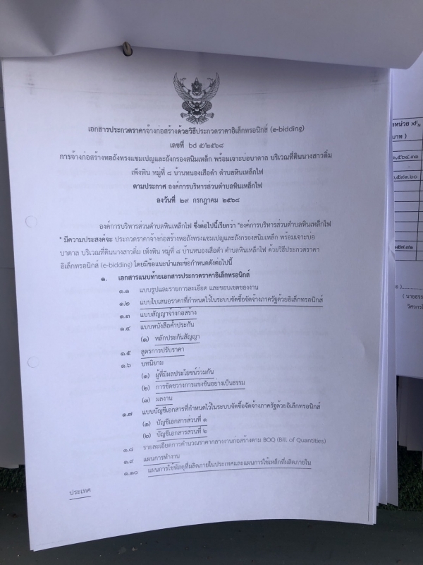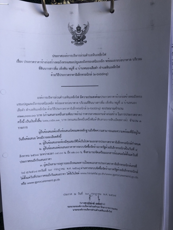 ประกาศประกวดราคาจ้าง โครงการก่อสร้างหอถังทรงแชมเปญและถังกรองสนิมเหล็ก พร้อมเจาะบ่อบาดาล บริเวณที่ดิน