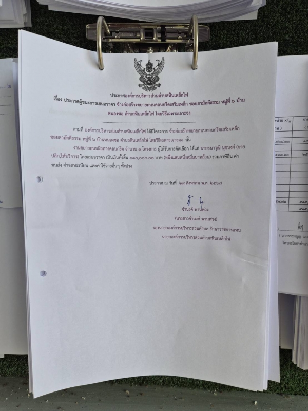 ประกาศผู้ชนะการเสนอราคา จ้างก่อสร้างขยายถนนคอนกรีตเสริมเหล็ก ซอยสามัคคีธรรม หมู่ที่ 6 บ้านหนองซอ