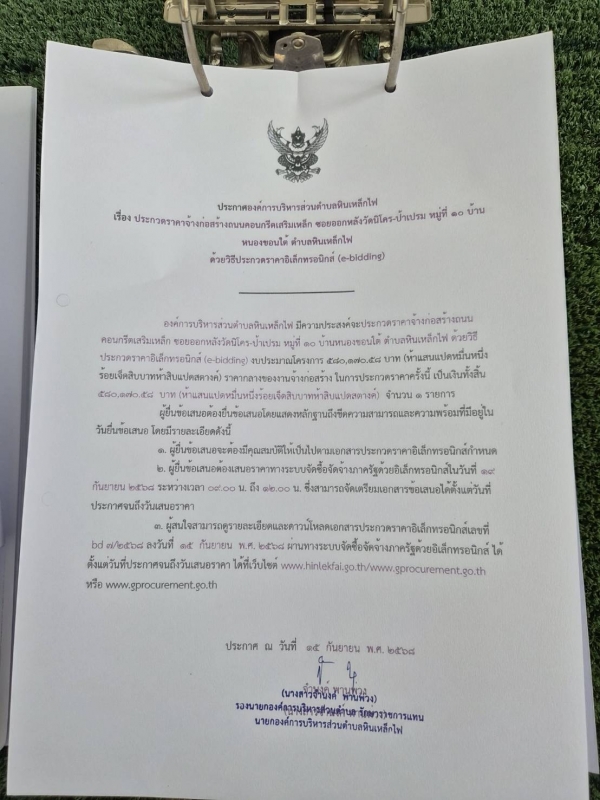 ประกาศ ประกวดราคาจ้าง ก่อสร้างถนนคอนกรีตเสริมเหล็ก ซอยออกหลังวัดนิโคร-ป้าเปรม หมู่ที่ 10 บ้านหนองขอนใต้ (e-bidding)