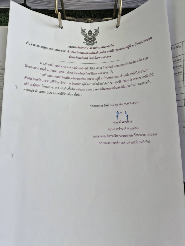 ประกาศ ผู้ชนะการเสนอราคา จ้างก่อสร้างถนนคอนกรีตเสริมเหล็ก ซอยฟักทองมาก หมู่ที่ 1 บ้านหนองขอน