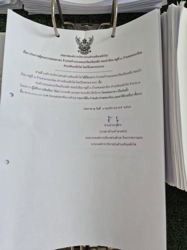 ประกาศ ผู้ชนะการเสนอราคาก่อสร้างถนนคอนกรีตเสริมเหล็ก ซอยบัวล้อม หมู่ที่ 3 บ้านหนองนกน้อย