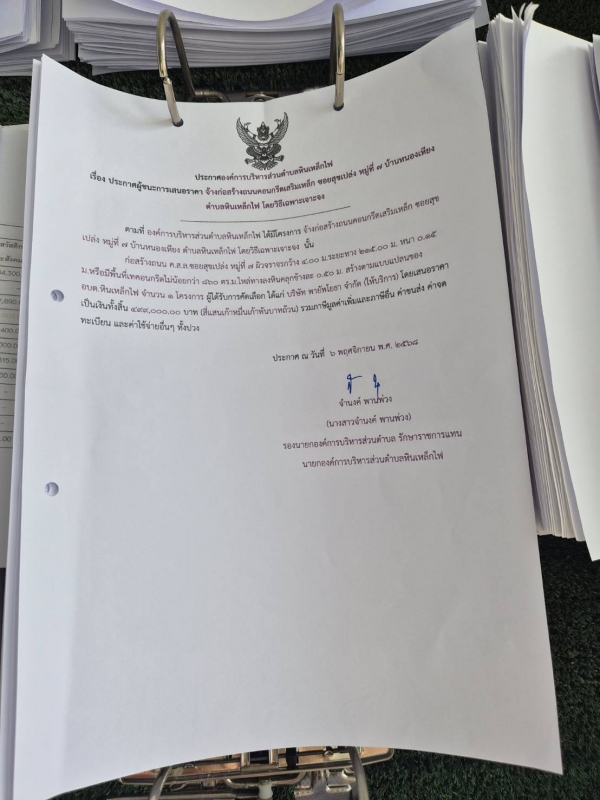 ประกาศ ผู้ชนะการเสนอราคาก่อสร้างถนนคอนกรีตเสริมเหล็ก ซอยสุขเปล่ง หมู่ที่ 7 บ้านหนองเหียง