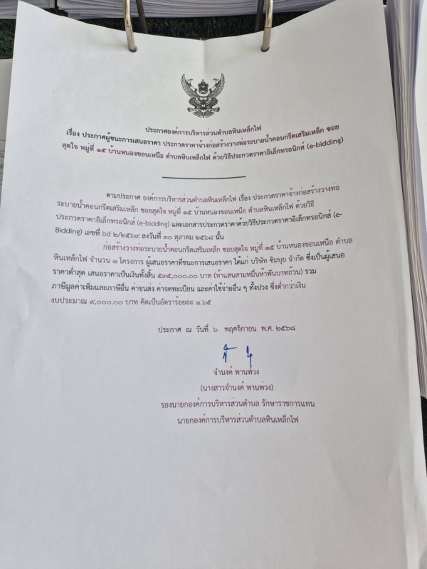 ประกาศ ผู้ชนะการเสนอราคาก่อสร้างวางท่อระบายน้ำคอนกรีตเสริมเหล็ก ซอยสุดใจ หมู่ที่ 15 บ้านหนองขอนเหนือ