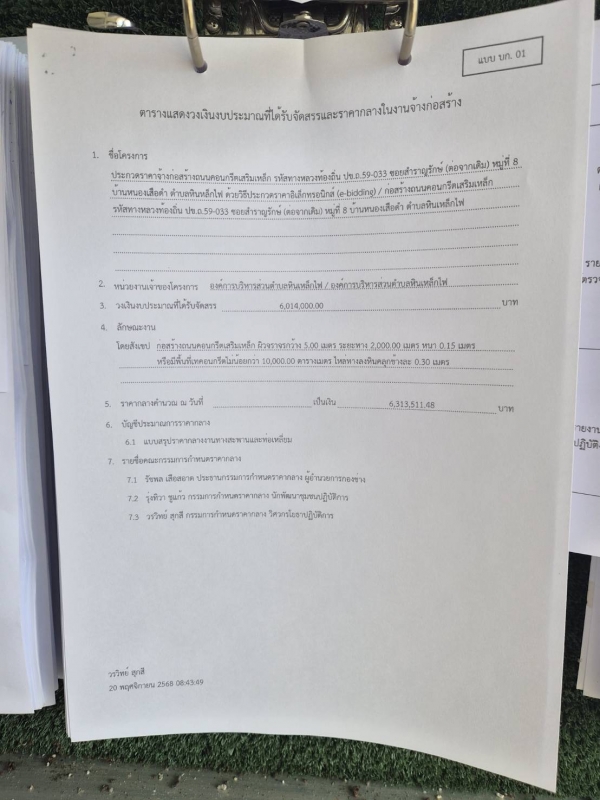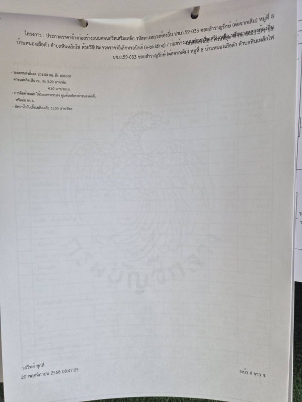 ประกาศ ราคากลางจ้างก่อสร้างถนนคอนกรีตเสริมเหล็ก รหัสทางหลวงท้องถิ่น ปข.ถ.59-033 ซอยสำราญรักษ์ (ต่อจากเดิม) หมู่ที่ 8 บ้านหนองเสือดำ