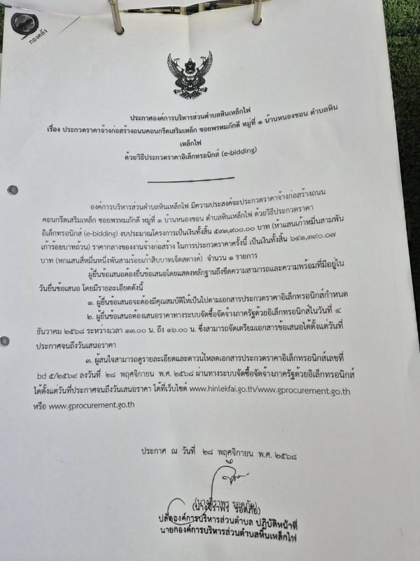 ประกาศ ประกวดราคาจ้างก่อสร้างถนนคอนกรีตเสริมเหล็ก ซอยพรหมภักดี หมู่ที่ 1 บ้านหนองขอน