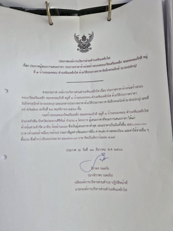 ประกาศ ผู้ชนะการเสนอราคาจ้างก่อสร้างถนนคอนกรีตเสริมเหล็ก ซอยพรหมภักดี หมู่ที่ 1 บ้านหนองขอน