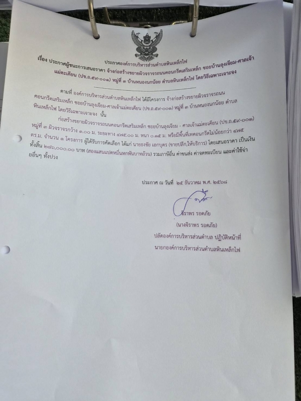 ประกาศ ผู้ชนะการเสนอราคาจ้างก่อสร้างขยายผิวจราจรถนนคอนกรีตเสริมเหล็ก ซอยบ้านลุงเจียม - ศาลแม่ตะเคียน