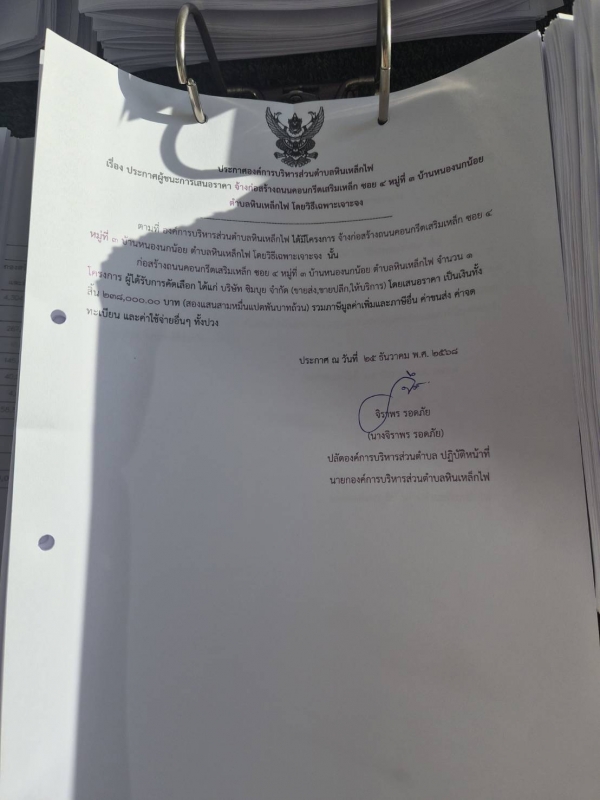 ประกาศ ผู้ชนะการเสนอราคาจ้างก่อสร้างถนนคอนกรีตเสริมเหล็ก ซอย4 หมู่ที่ 3 บ้านหนองนกน้อย