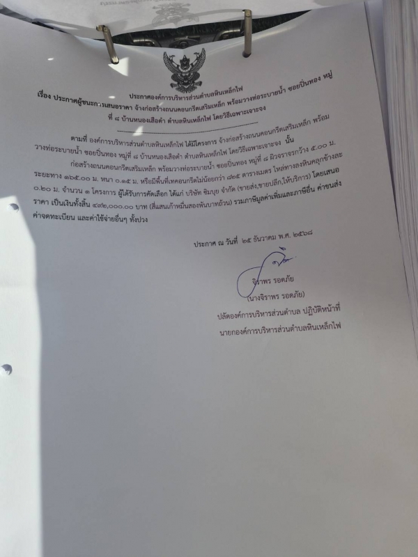 ประกาศ ผู้ชนะการเสนอราคาจ้างก่อสร้างถนนคอนกรีตเสริมเหล็ก พร้อมวางท่อระบายน้ำ ซอยปิ่นทอง หมู่ที่ 8 บ้านหนองเสือดำ