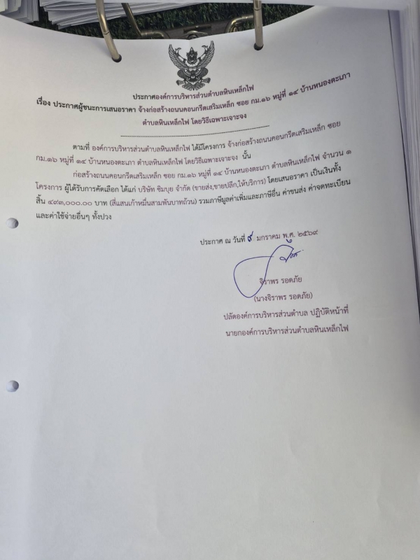 ประกาศ ผู้ชนะการเสนอราคาจ้างก่อสร้างถนนคอนกรีตเสริมเหล็ก ซอยกม.16 หมู่ที่ 4 บ้านหนองตะเภา