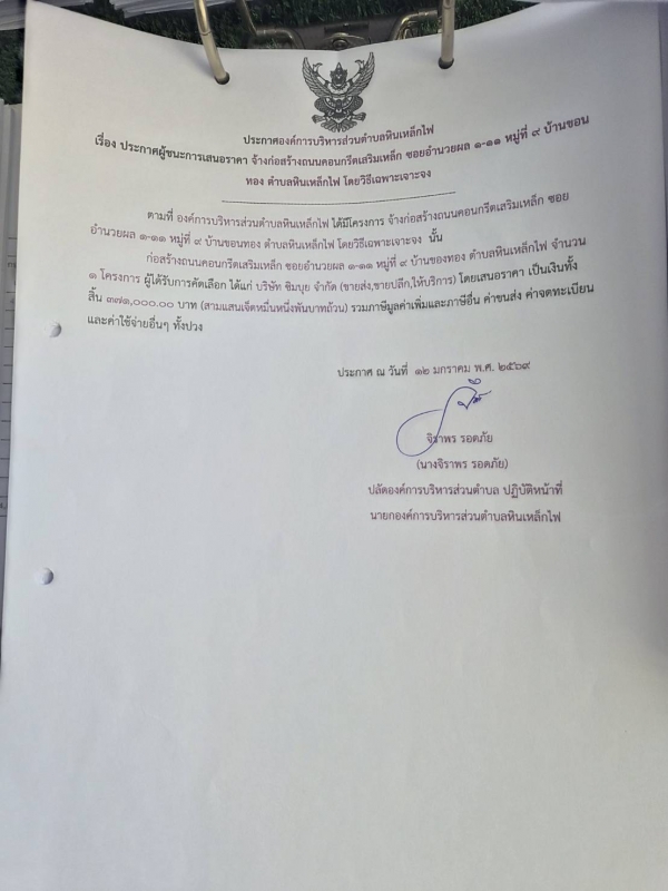 ประกาศ ผู้ชนะการเสนอราคาจ้างก่อสร้างถนนคอนกรีตเสริมเหล็ก ซอยอำนวยผล 111 หมู่ที่ 9 บ้านขอนทอง