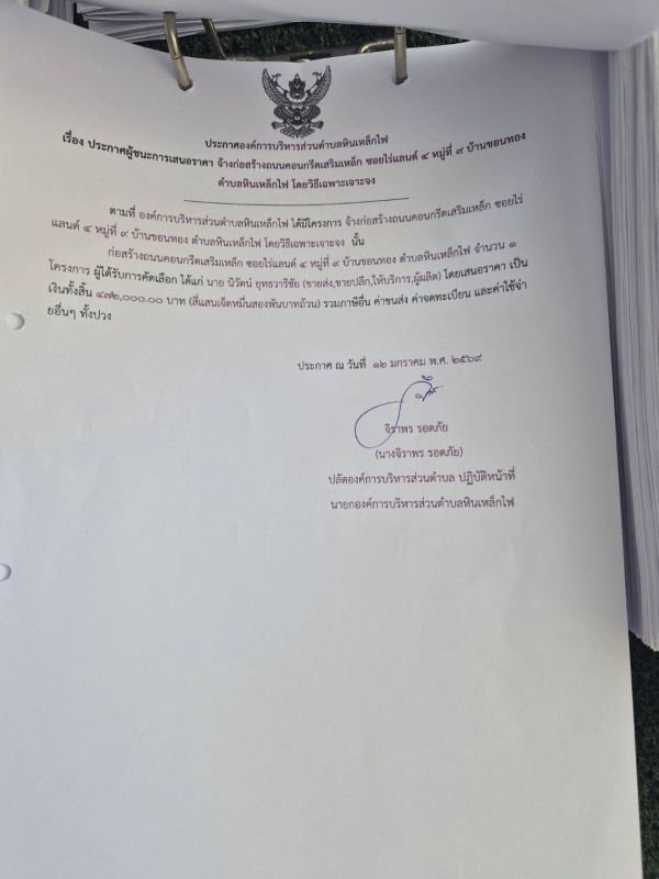 ประกาศ ผู้ชนะการเสนอราคาจ้างก่อสร้างถนนคอนกรีตเสริมเหล็ก ซอยไร่แลนด์ 4 หมู่ที่ 9 บ้านขอนทอง
