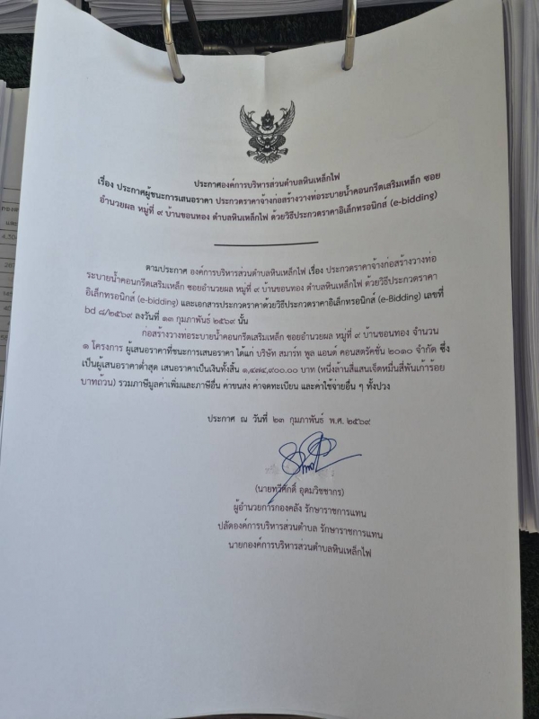 ประกาศ ผู้ชนะการเสนอราคาจ้างก่อสร้างวางท่อระบายน้ำคอนกรีตเสริมเหล็ก ซอยอำนวยผล หมู่ที่ 9 บ้านขอนทอง.