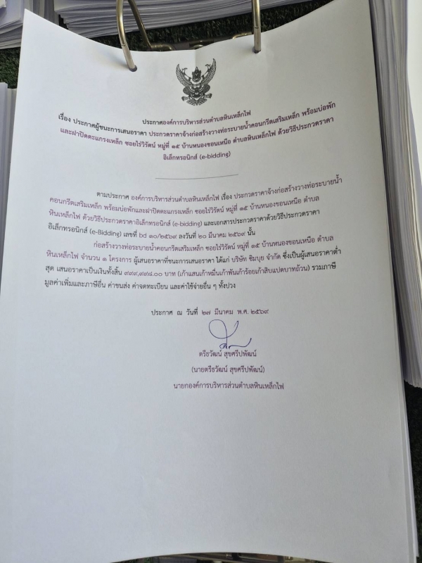 ประกาศ ผู้ชนะการเสนอราคาจ้างก่อสร้างวางท่อระบายน้ำคอนกรีตเสริมเหล็ก ขนาด Ø 0.40 เมตร พร้อมบ่อพักและฝ