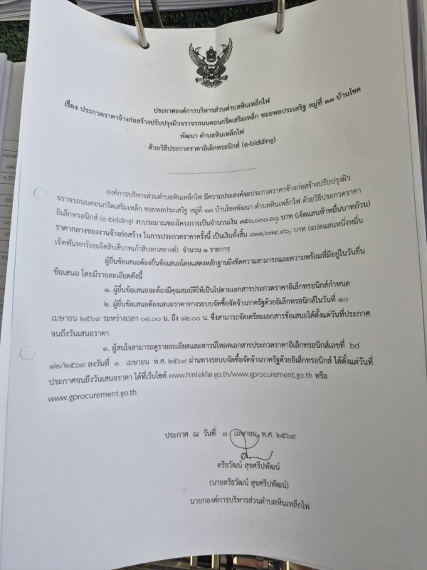 ประกาศ ประกวดราคาจ้างปรับปรุงผิวจราจรถนนคอนกรีตเสริมเหล็ก ซ.พลประเสริฐ ม.13 บ้านโชคพัฒนา